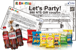 1該禮卷價值990新台幣。如果使用者設計的Juuway DIY T恤價格高於禮卷價值,將需要要支付額外費用。