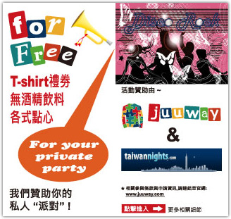 你和朋友們正在籌備一場趴嗎?不管是生日趴、結婚紀念趴、新婚派對,還是慶祝喬遷、歡送友人, Juuway都非常榮幸能夠提供你一張免費的Juuway T恤禮卷,兩大罐的汽水和點心,以及更多折價的禮卷。酷吧,請聯絡我們或是來電02-2735-0695以取得更多資訊。